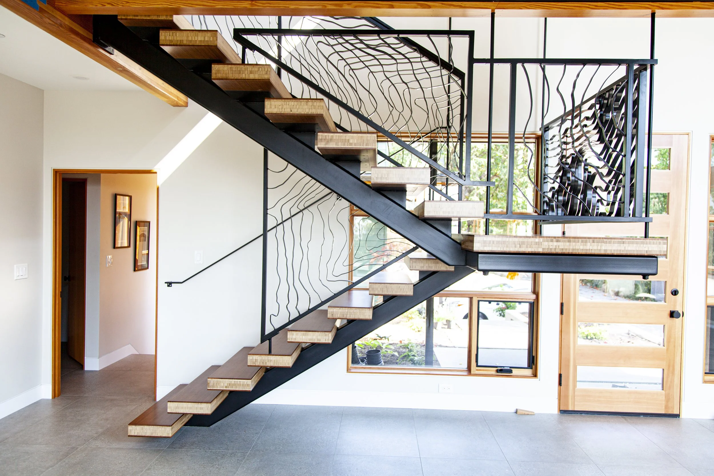 This project includes more than 130 linear feet of custom guard rail, 5 light fixtures, and a custom projector mount which descends from the ceiling. The rails are steel, and each rung has been hand bent to form a topographical map which corresponds to significant locations to my clients.