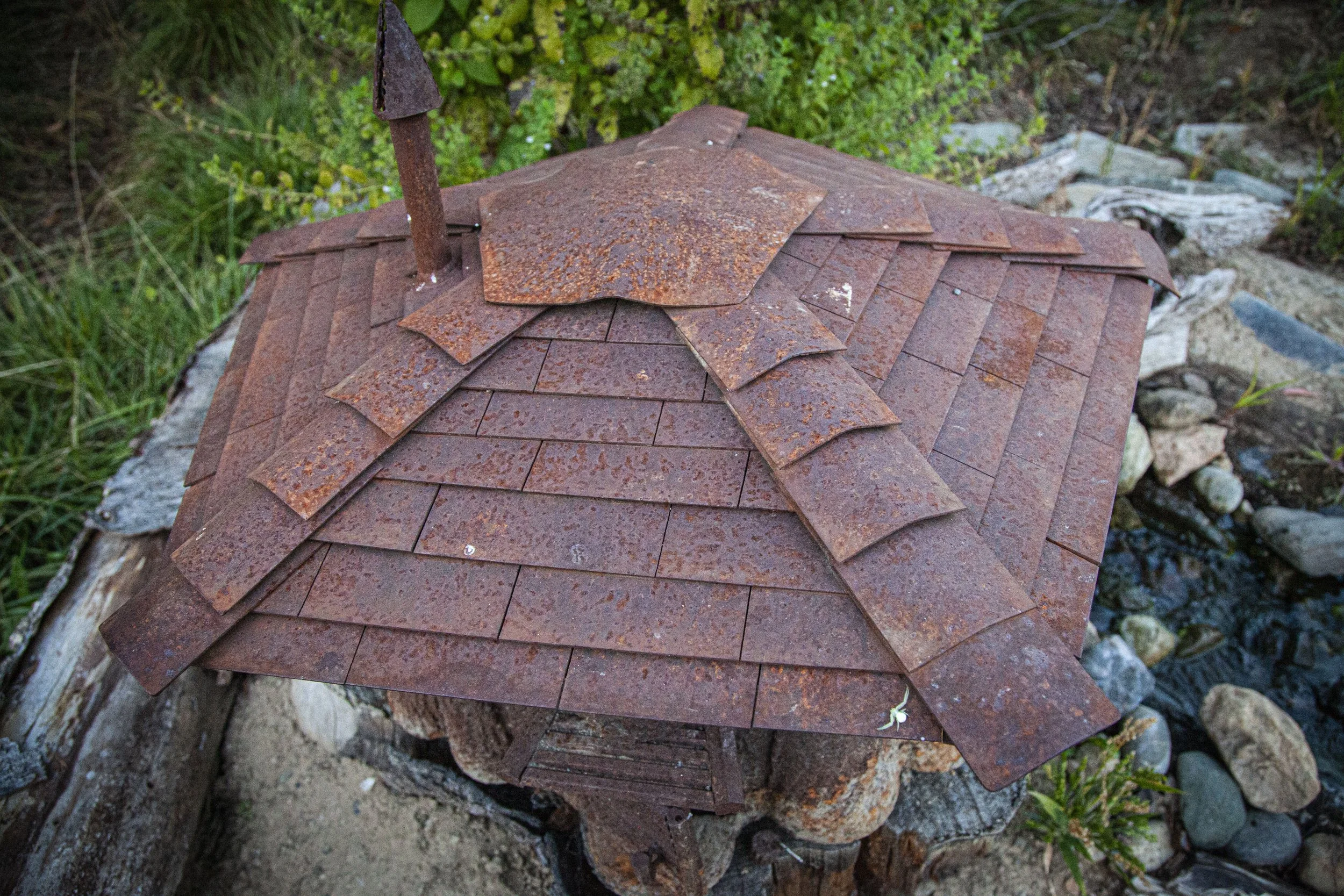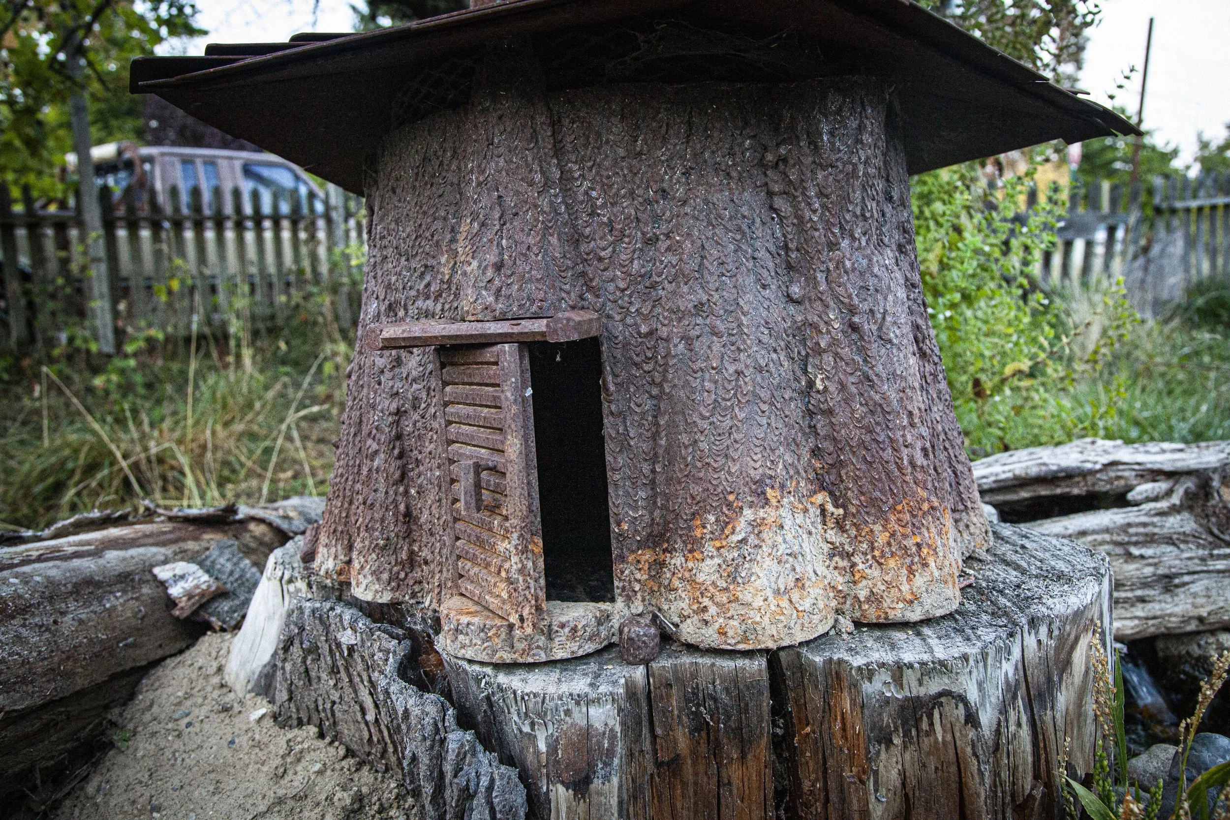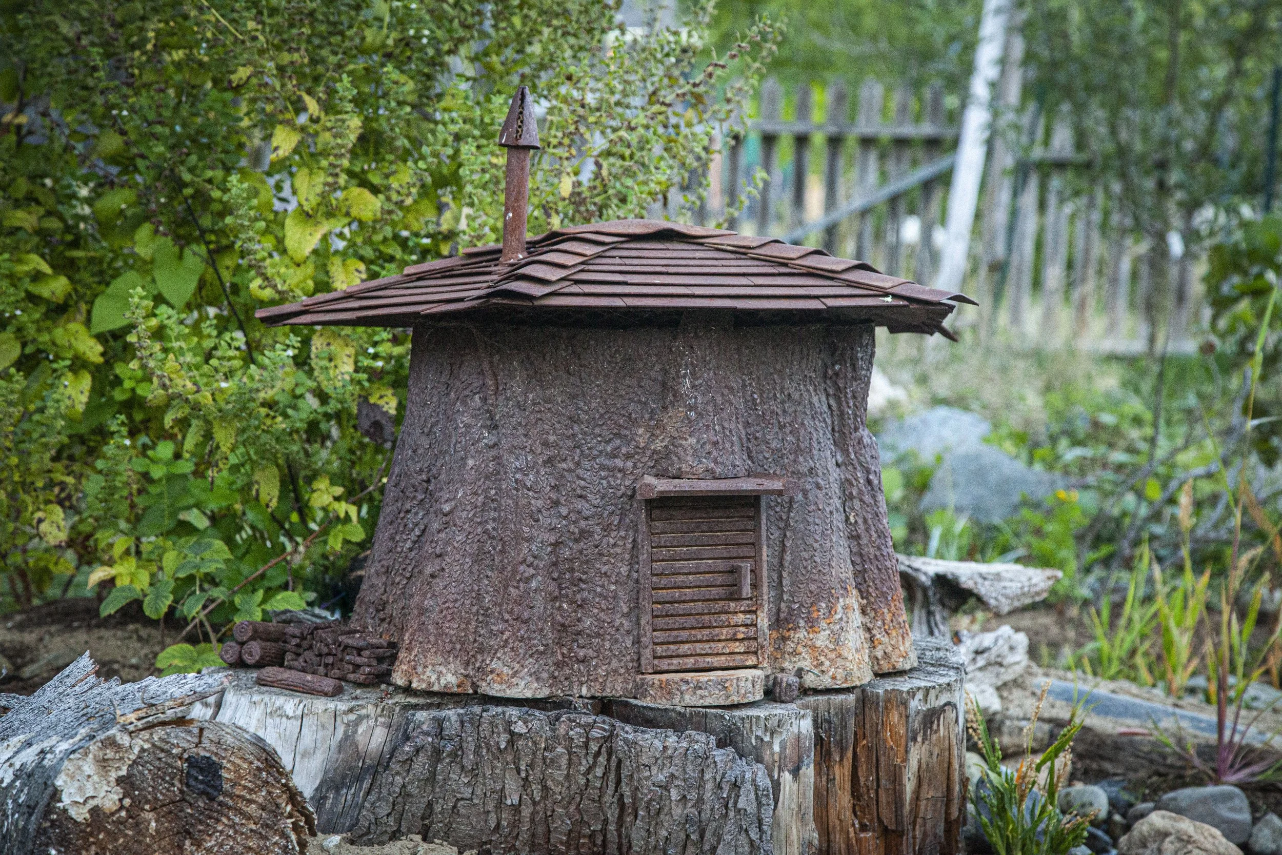 Along with a working door, this stump house comes with a decent pile of rebar based firewood. A few TIG welded logs. A chopping stump complete with stainless steel hatchet. Inside it even features a wood stove and a book shelf.