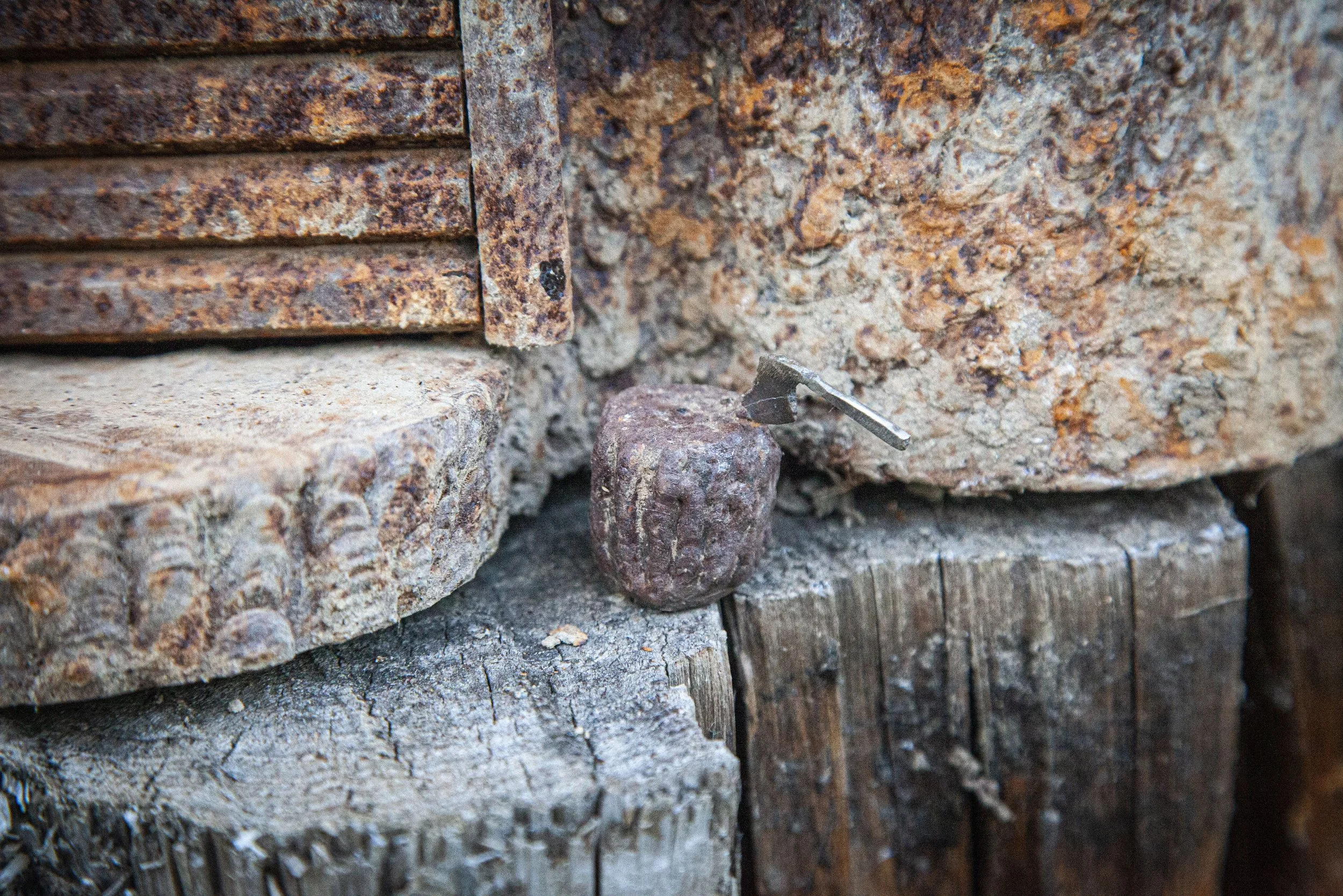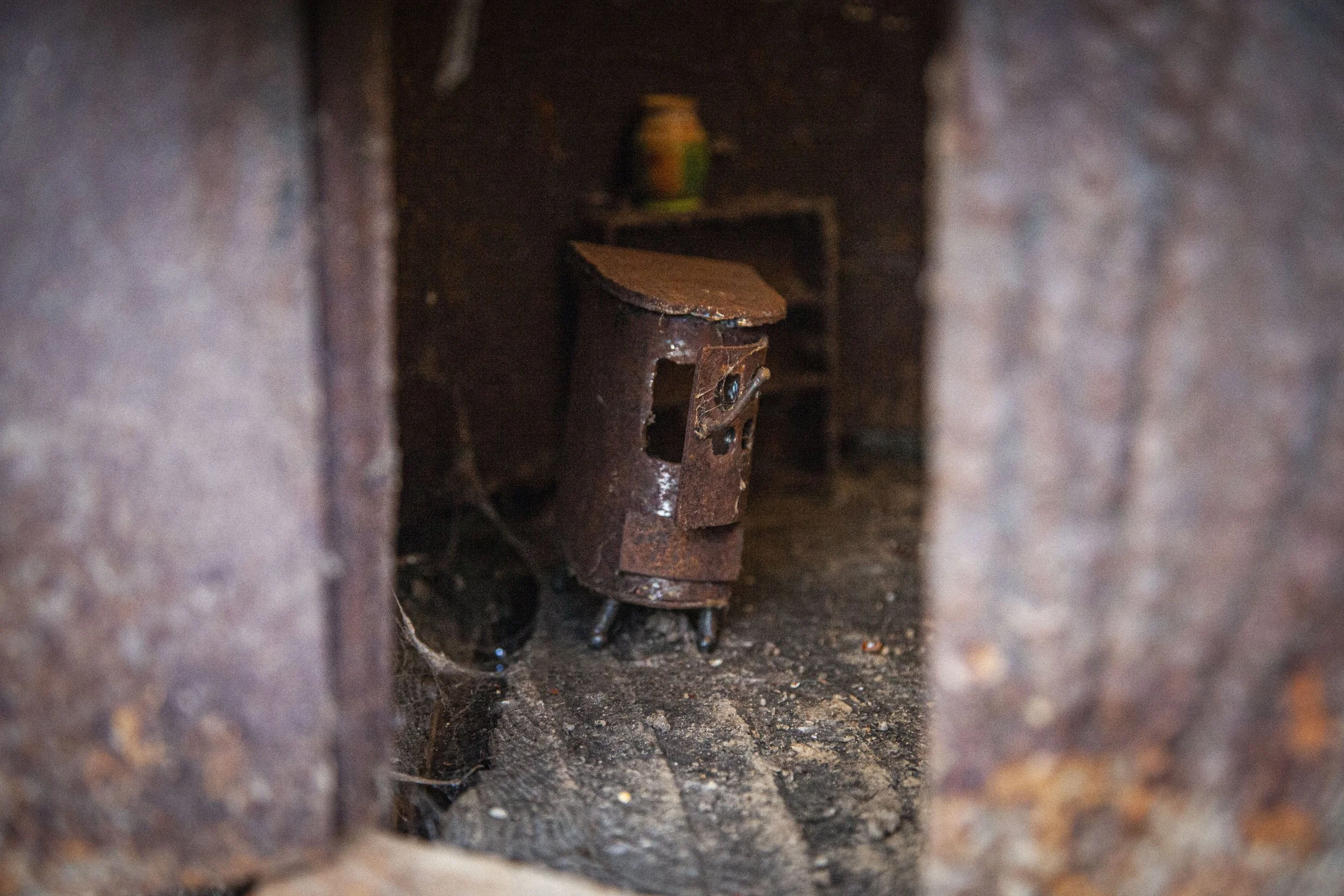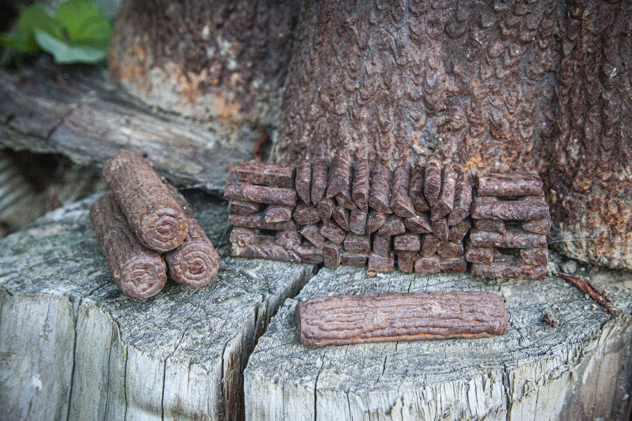 Along with a working door, this stump house comes with a decent pile of rebar based firewood. A few TIG welded logs. A chopping stump complete with stainless steel hatchet. Inside it even features a wood stove and a book shelf.